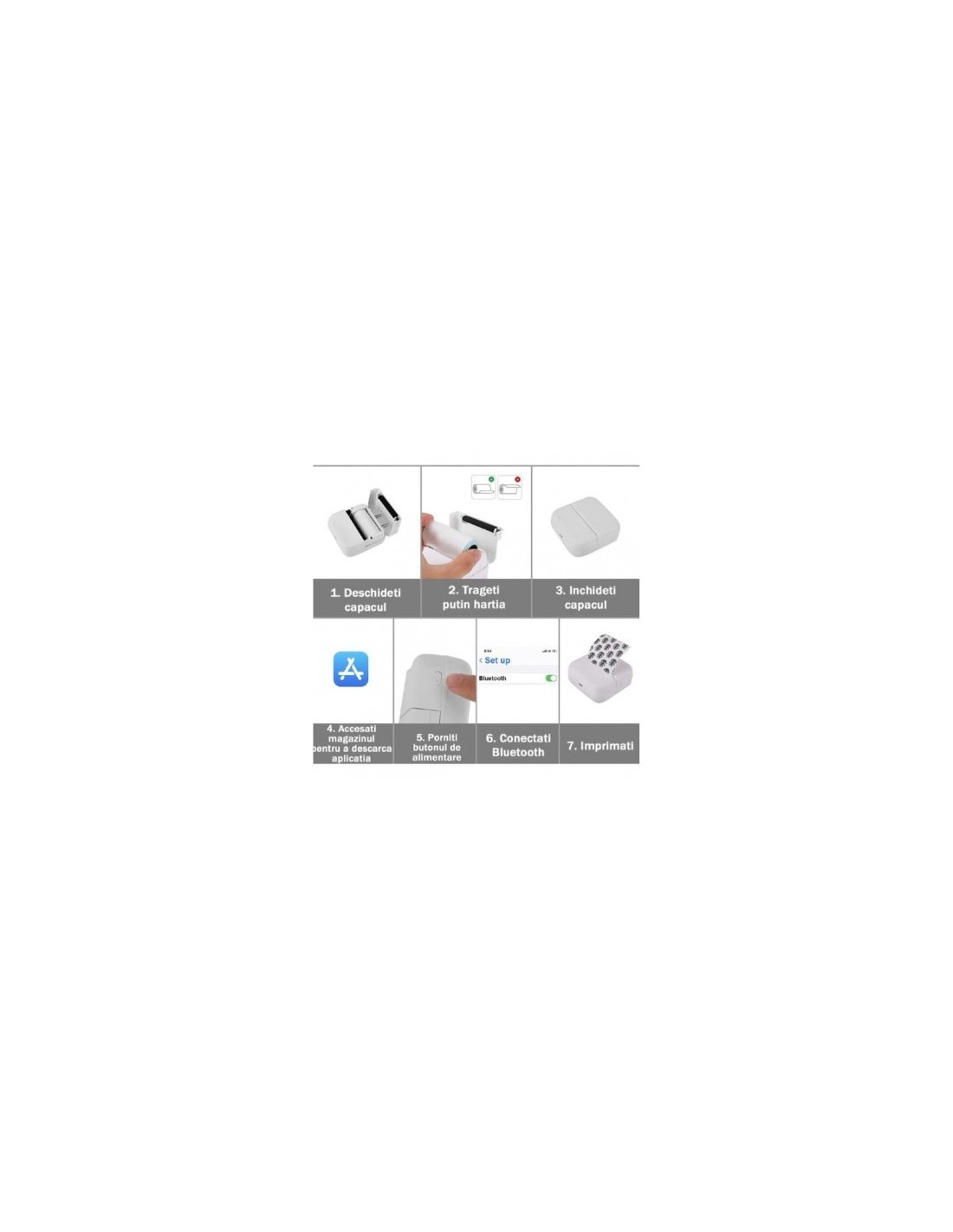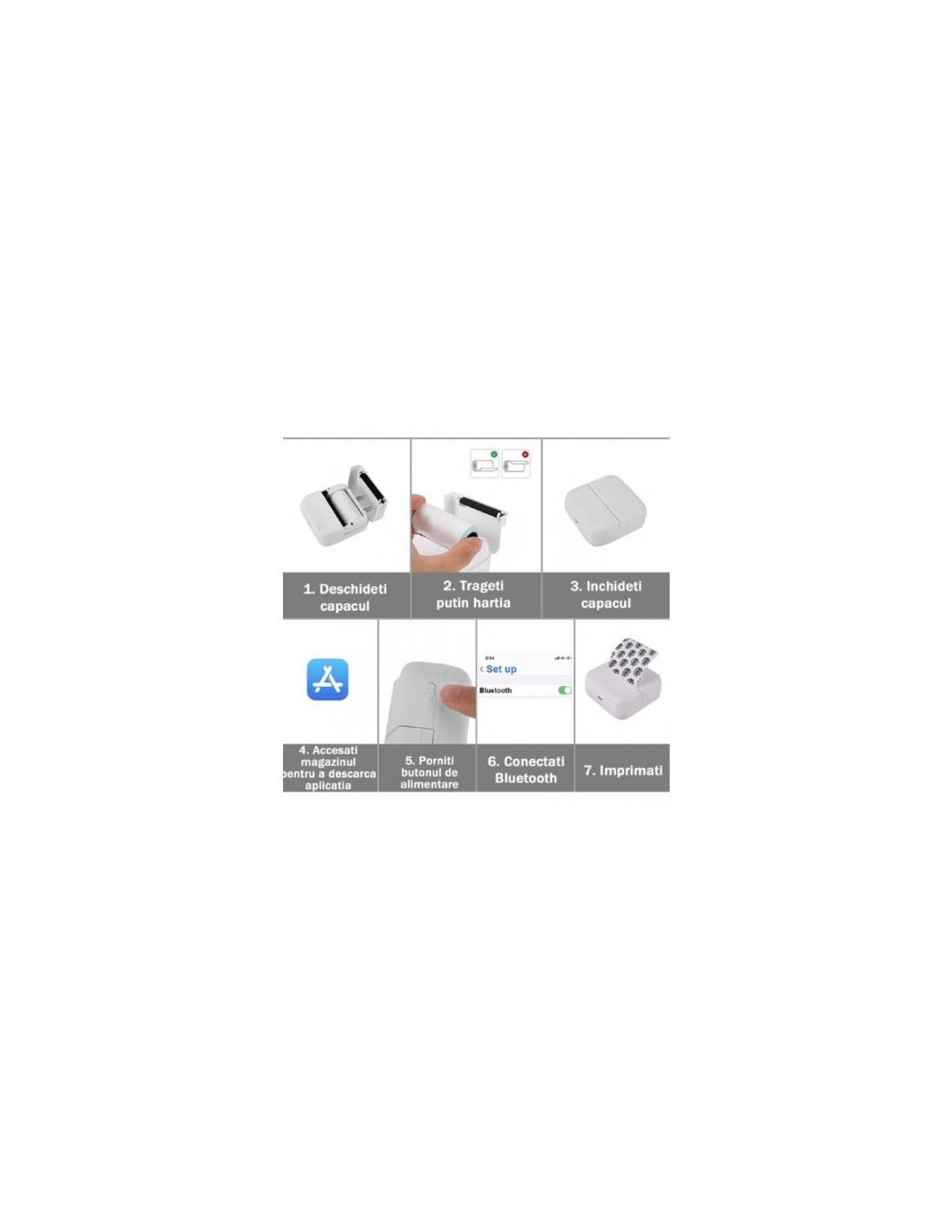 Mini imprimanta termica alb/negru - Imprimanta mobila multifunctionala este buna pentru a face fotografii, a imprima, a lua ramas bun de la scrierea de mana si a va imbunatati eficienta invatarii. Imprimanta de note de studiu, efectul imprimarii de inalta rezolutie. Textul si imaginile dactilografiate sunt mai clare si de calitate superioara, facand oamenii mai eficienti in invatare, lucru si divertisment. 10 role suplimentare de hartie de tiparit, dimensiunea 57 mm x 5 M.