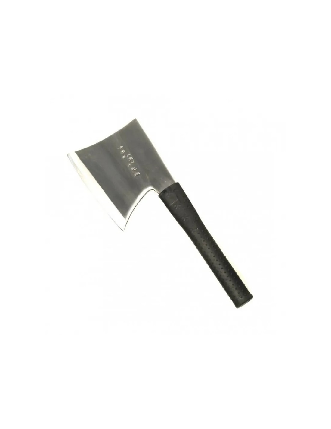 Satâr de bucătărie, cu tăiș curbat și mâner cauciucat. Metalul tăișului continuă și în interiorul mânerului.